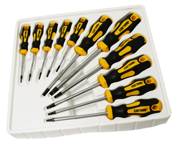 Schraubendrehersatz mit T-Profil ohne Stirnlochbohrung. Enthalten sind im Schraubendreher-Set folgende Größen jeweils einmal T6, T7, T8, T9, T10, T15, T20, T25, T27, T30 und T40,